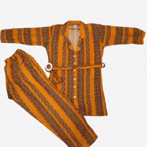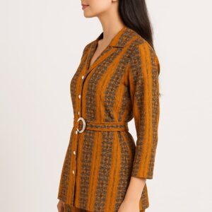 This mustard yellow printed co-ord set is your instant glow-up in fabric form. With bold ethnic stripes and an unapologetic vibe, it says “I woke up like this… and then added heels.” The soft cotton hugs you like your toxic ex never could, and the belt? That’s your built-in waist snatcher, babe.