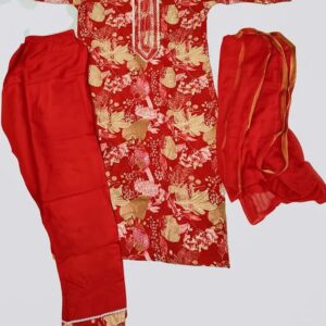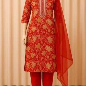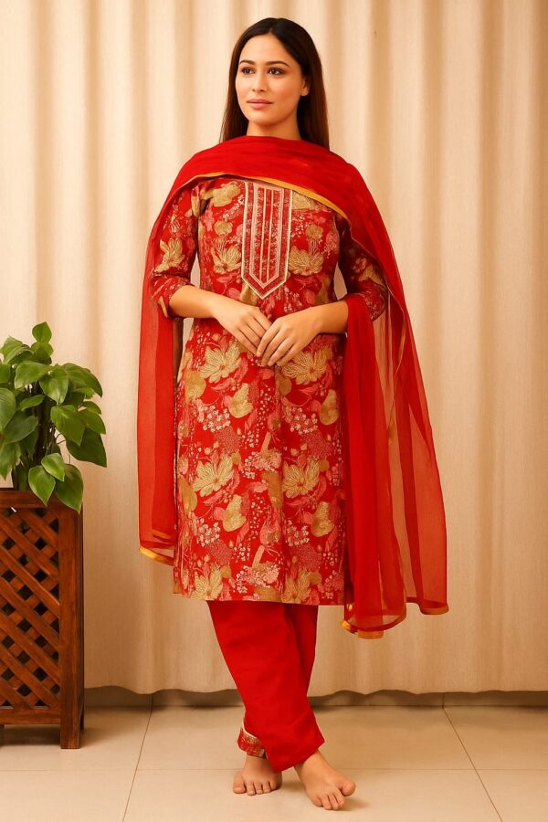 This stunner is dipped in a bold red hue and drenched in golden floral drama—because subtlety is for WhatsApp forwards, not your wardrobe. The rich embroidery on the neck screams “I woke up like this – flawless and festive.”