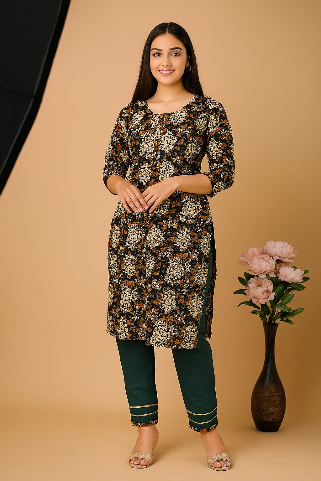 Dive into drama with this rich floral-printed kurti paired with deep green pants that hug you like your mom after you finally came home on time. The black base is as mysterious as your browser history, and those golden blooms? Let’s just say, they do all the talking when you walk in.