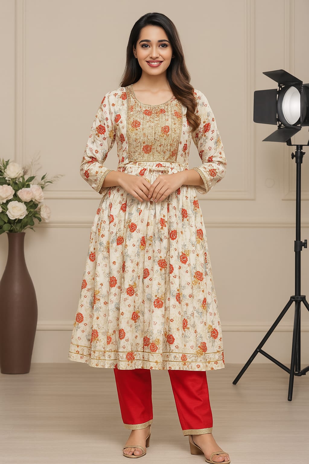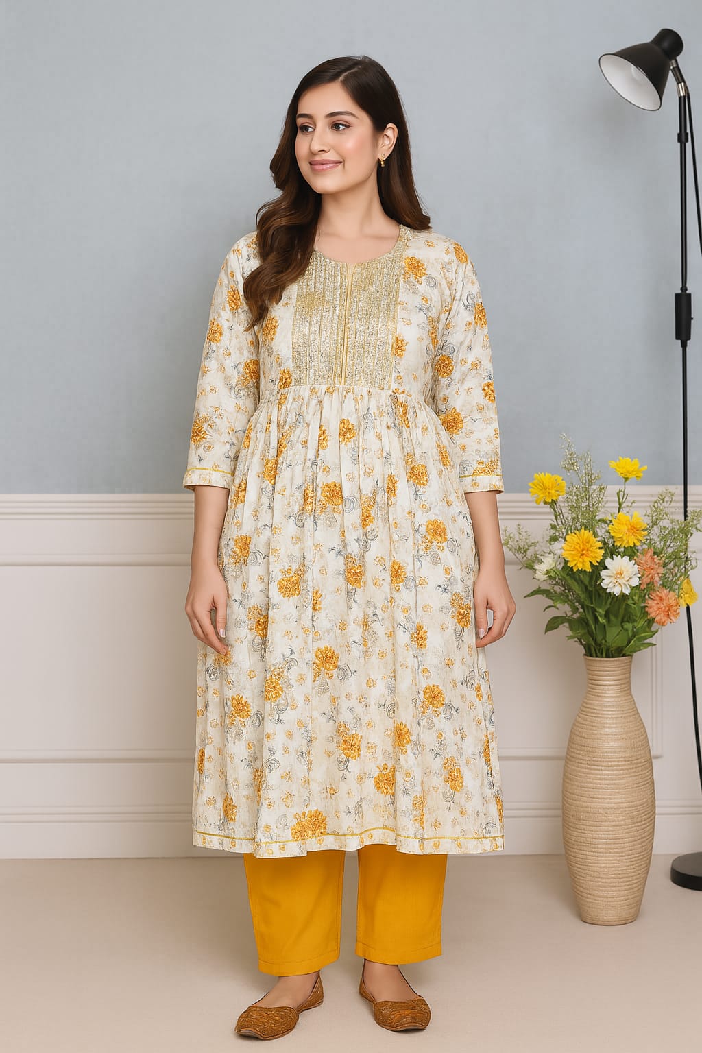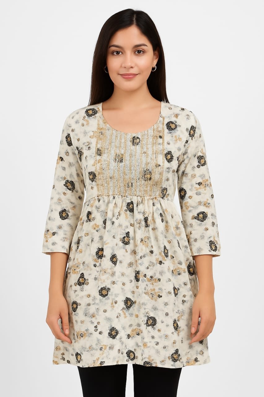 This kurti doesn’t whisper elegance—it giggles in florals. With blooming prints, delicate embroidery, and a flattering empire waist, it’s designed for the girl who’s equal parts chaai lover and chaandni chowk runway model.