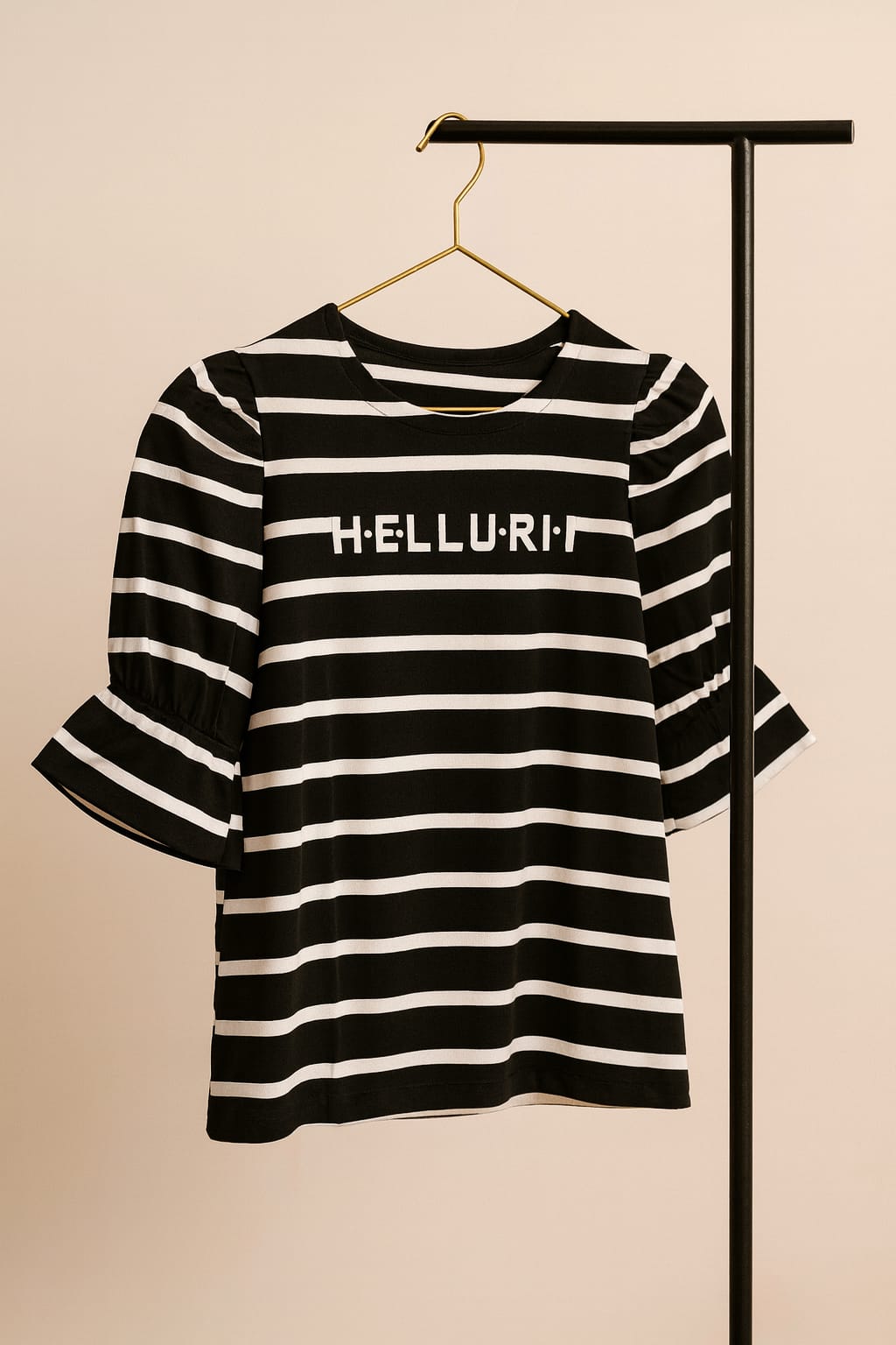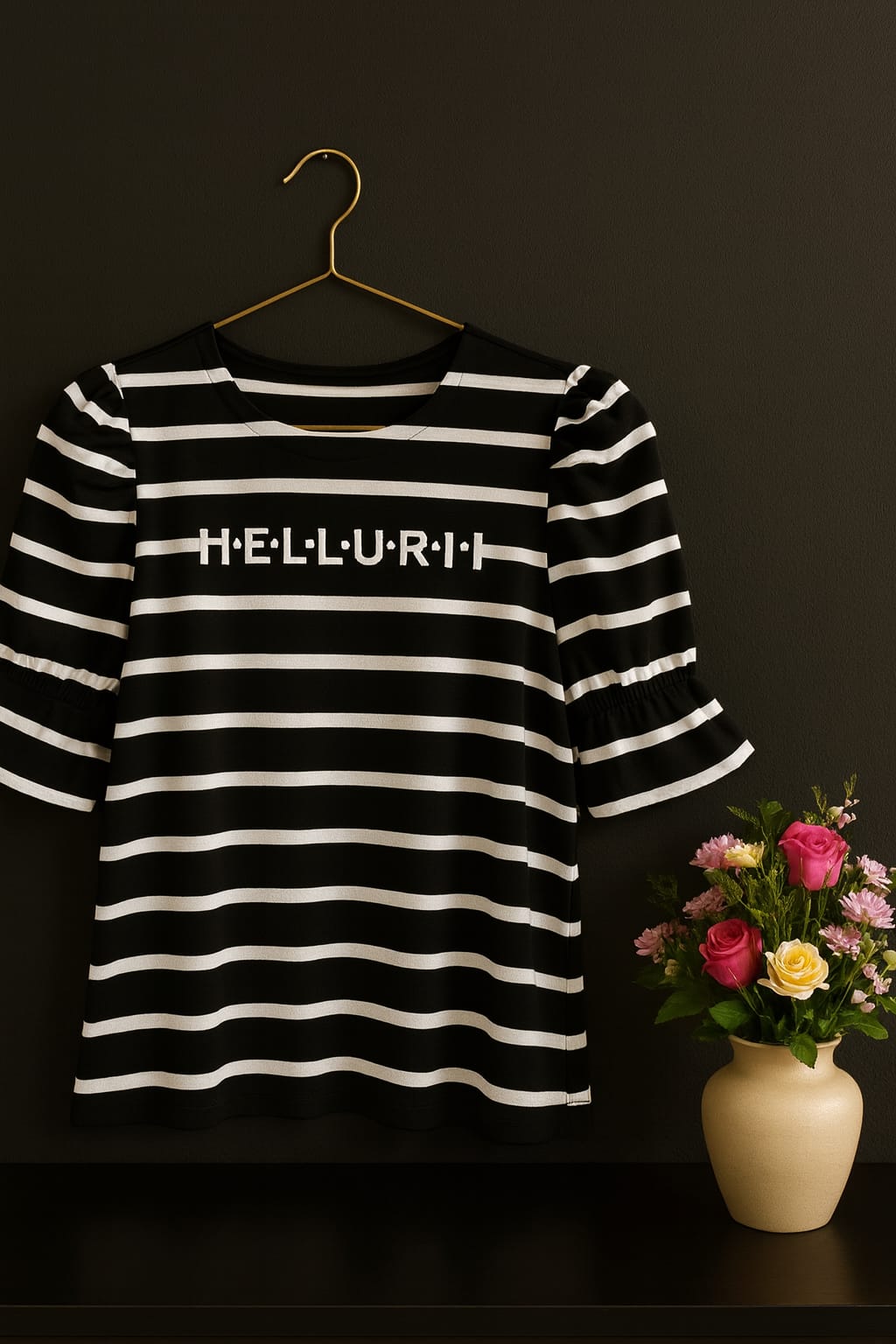 Say hellurr to your new favorite mood-lifter! This black-and-white striped beauty isn’t just a top—it’s a mood, a moment, and a mini-mic drop rolled into one.
